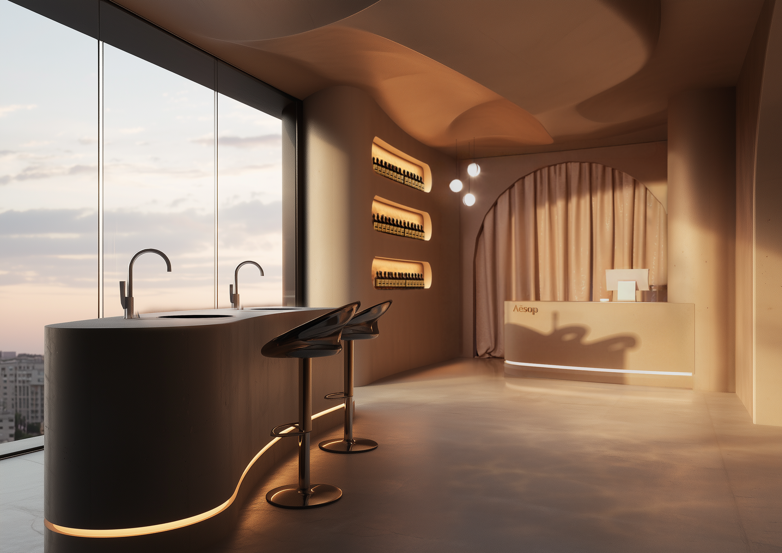 This conceptual retail environment for Aesop reimagines the shopping experience as a sensorial journey - one that invites visitors into a sculptural and immersive world, far removed from the everyday. Inspired by surrealism and the poetic nature of the brand itself, the design merges light, texture, and form to create a space that is both grounded and otherworldly. Soft curves, mineral inspired materials, and ambient floor lighting establish a dreamlike atmosphere where visitors are encouraged to pause, explore, and reflect.